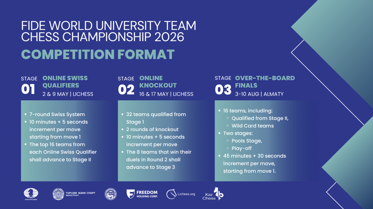 O Campeonato Mundial Universitário de Xadrez por Equipes é uma iniciativa conjunta da FIDE, Federação Cazaque de Xadrez, administração da cidade de Almaty e o Ministério do Esporte e Turismo do Cazaquistão. Este torneio inovador será realizado em três etapas distintas, projetadas para identificar as equipes mais preparadas do planeta. A jornada começa com qualificatórias online no formato Suíço, seguidas por uma fase de eliminação direta (Knockout), culminando nas grandes finais presenciais em Almaty.