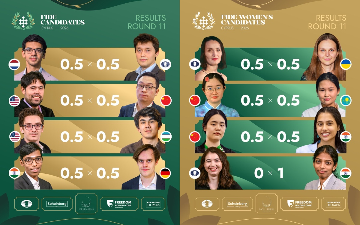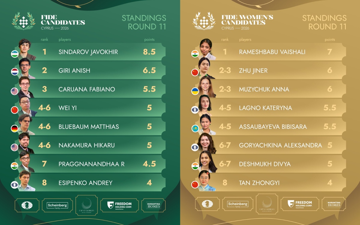 A 11ª rodada do Campeonato FIDE Candidates, realizada no luxuoso Cap St. Georges Hotel & Resort, em Chipre, trouxe emoções contidas no torneio aberto e uma virada decisiva na disputa feminina. Javokhir Sindarov manteve sua liderança de dois pontos com uma série de empates estratégicos, enquanto Vaishali R. brilhou com uma vitória crucial sobre Aleksandra Goryachkina, assumindo a ponta isolada a apenas três rodadas do fim.