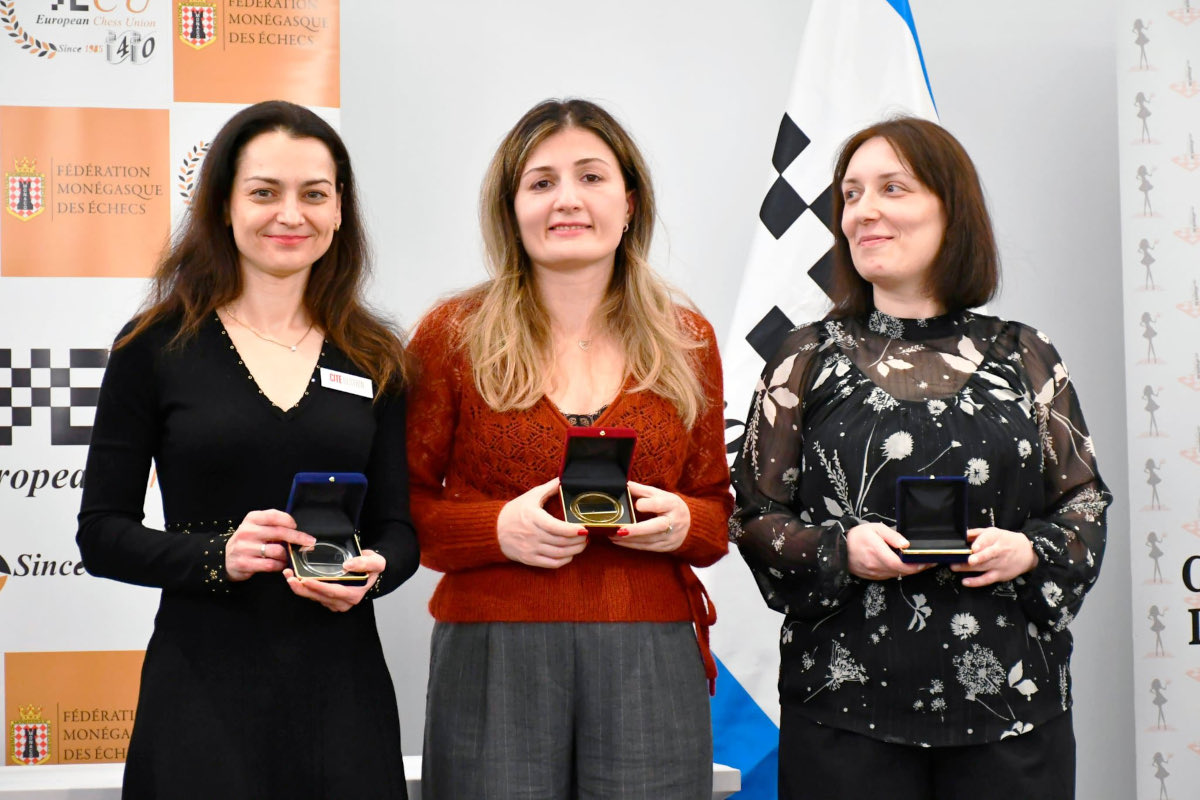 O Campeonato Europeu de Rápidas Feminino, realizado no último fim de semana em Monte-Carlo, reuniu 143 jogadoras de 30 países em um torneio suíço de 11 rodadas com controle de tempo de 15+10. Após liderar grande parte da competição, Alexandra Kosteniuk foi ultrapassada na rodada final por Nino Batsiashvili, que garantiu o título nos critérios de desempate. O evento também contou com uma impressionante trajetória invicta da jovem Bodhana Sivanandan, de apenas dez anos, além de uma disputa acirrada pelas demais posições do pódio. | Pictured: Kosteniuk, Batsiashvili and third-placed Sofio Gvetadze. | Photo: European Chess Union