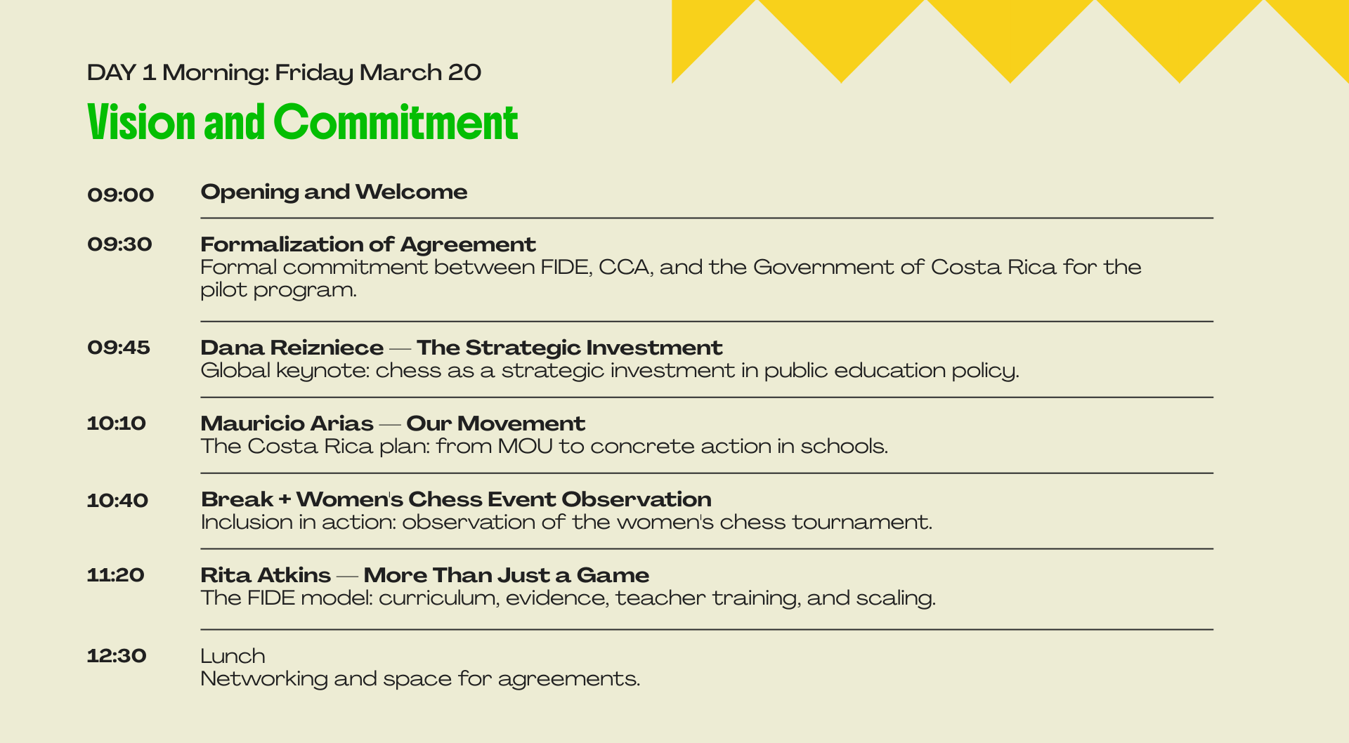 O ápice da cúpula será o lançamento de um programa piloto nacional. Em uma ação conjunta entre FIDE, CCA, FCA e o Ministério da Educação Pública, dez escolas costarriquenhas iniciarão a implementação de um currículo de xadrez em sala de aula, marcando um precedente para futuras expansões e servindo como modelo para outros países interessados em replicar a iniciativa. Este programa visa validar a eficácia do xadrez como ferramenta educacional em um ambiente escolar real, coletando dados e melhores práticas para um escalonamento futuro.
