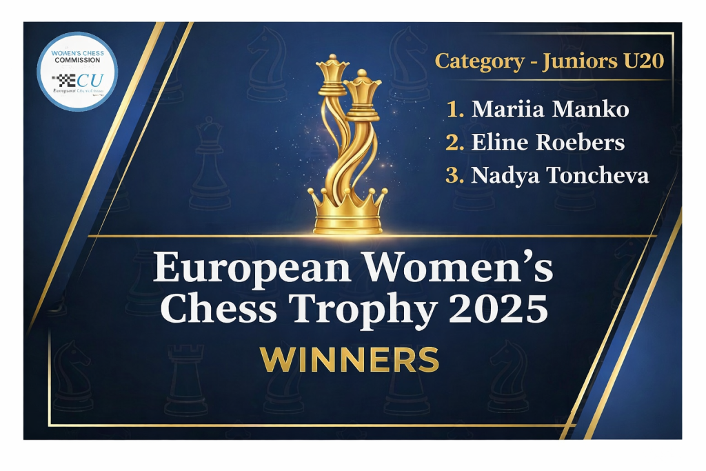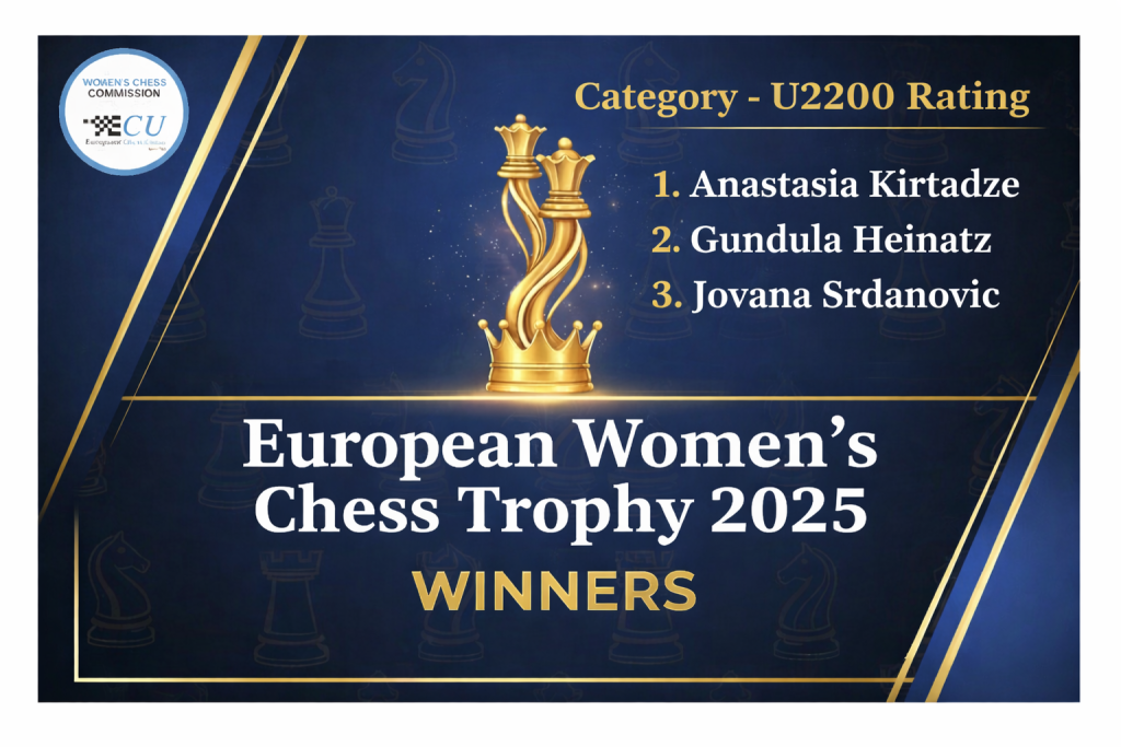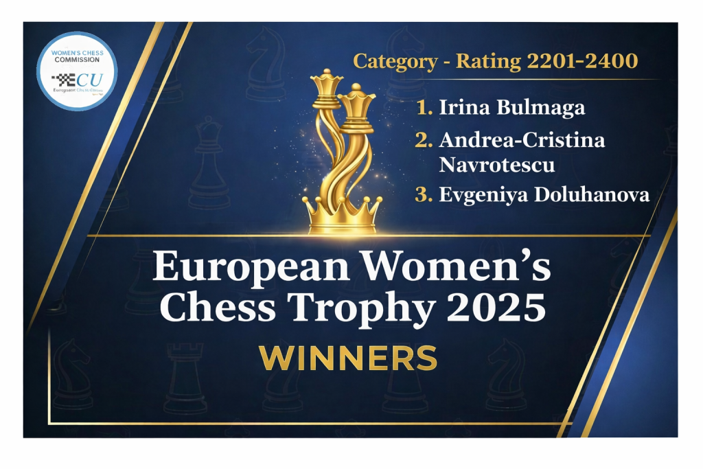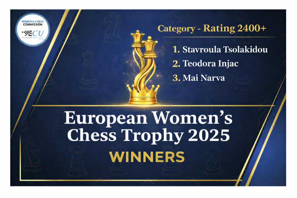 A Comissão de Xadrez Feminino da União Europeia de Xadrez (ECU) anunciou as aguardadas vencedoras do “European Women’s Chess Trophy 2025”. Este projeto inovador, apoiado pelo Fundo de Desenvolvimento da FIDE, visa reconhecer e recompensar financeiramente as enxadristas que se destacam em torneios exclusivamente femininos por toda a Europa, impulsionando a participação e o talento no xadrez feminino.