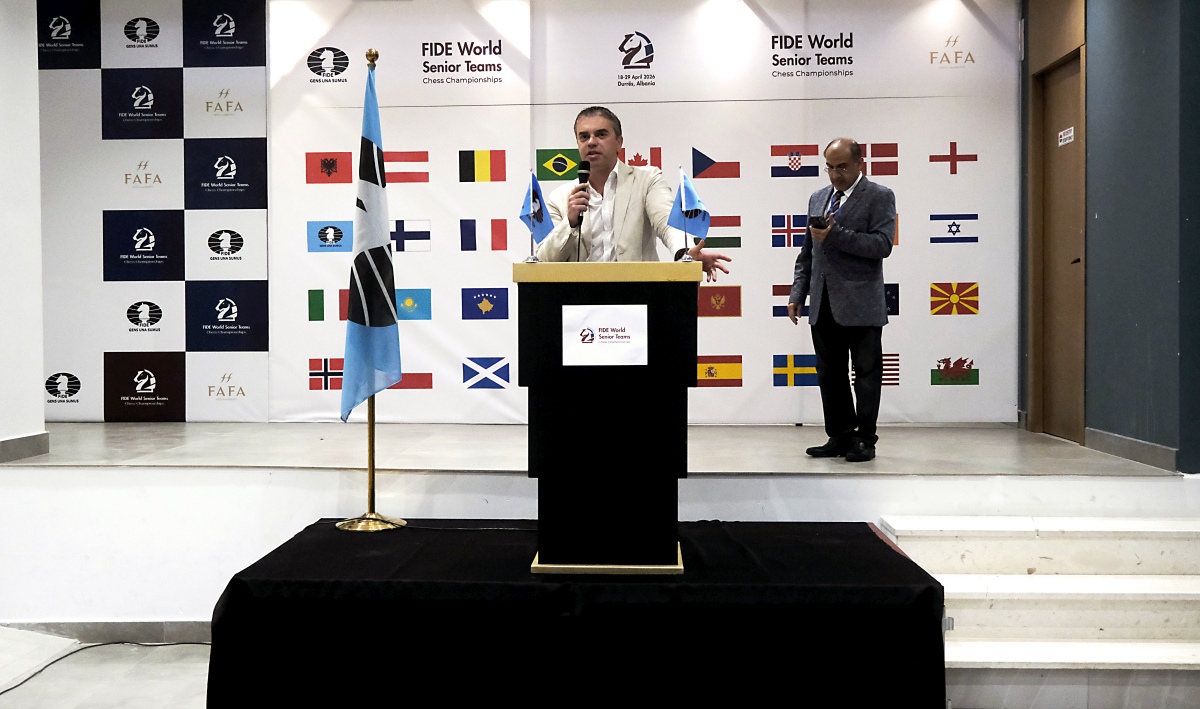 A cerimônia de abertura, conduzida pelo Árbitro Chefe IA Mahdi Abdulrahim, foi um momento solene que contou com a presença de importantes personalidades do xadrez mundial. Discursos de boas-vindas foram proferidos por Erald Dervishi, Presidente da Federação Albanesa de Xadrez (na imagem), Zurab Azmaiparashvili, Presidente da União Europeia de Xadrez, e Georgios Makropoulos, Vice-Presidente do Conselho da FIDE, que ressaltaram a importância do evento para a comunidade enxadrística global.