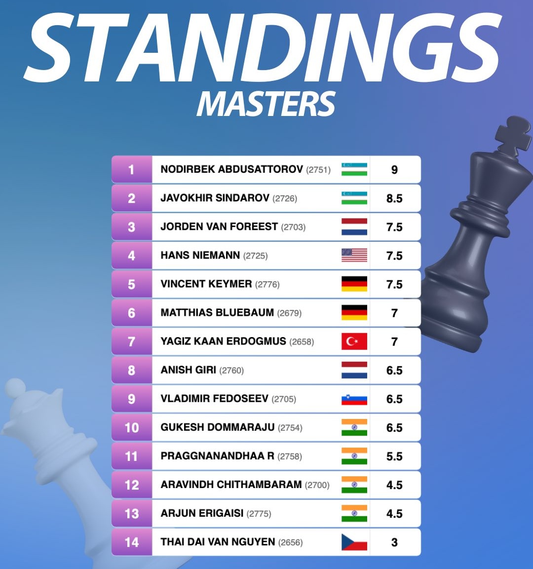 “Que grande conquista de Nodirbek Abdusattorov. Ele jogou em um nível muito alto e estável durante todo o torneio. Nos últimos anos, sempre esteve muito perto, e agora ele conquistou o título com mérito.” — Jeroen van den Berg, diretor do torneio.