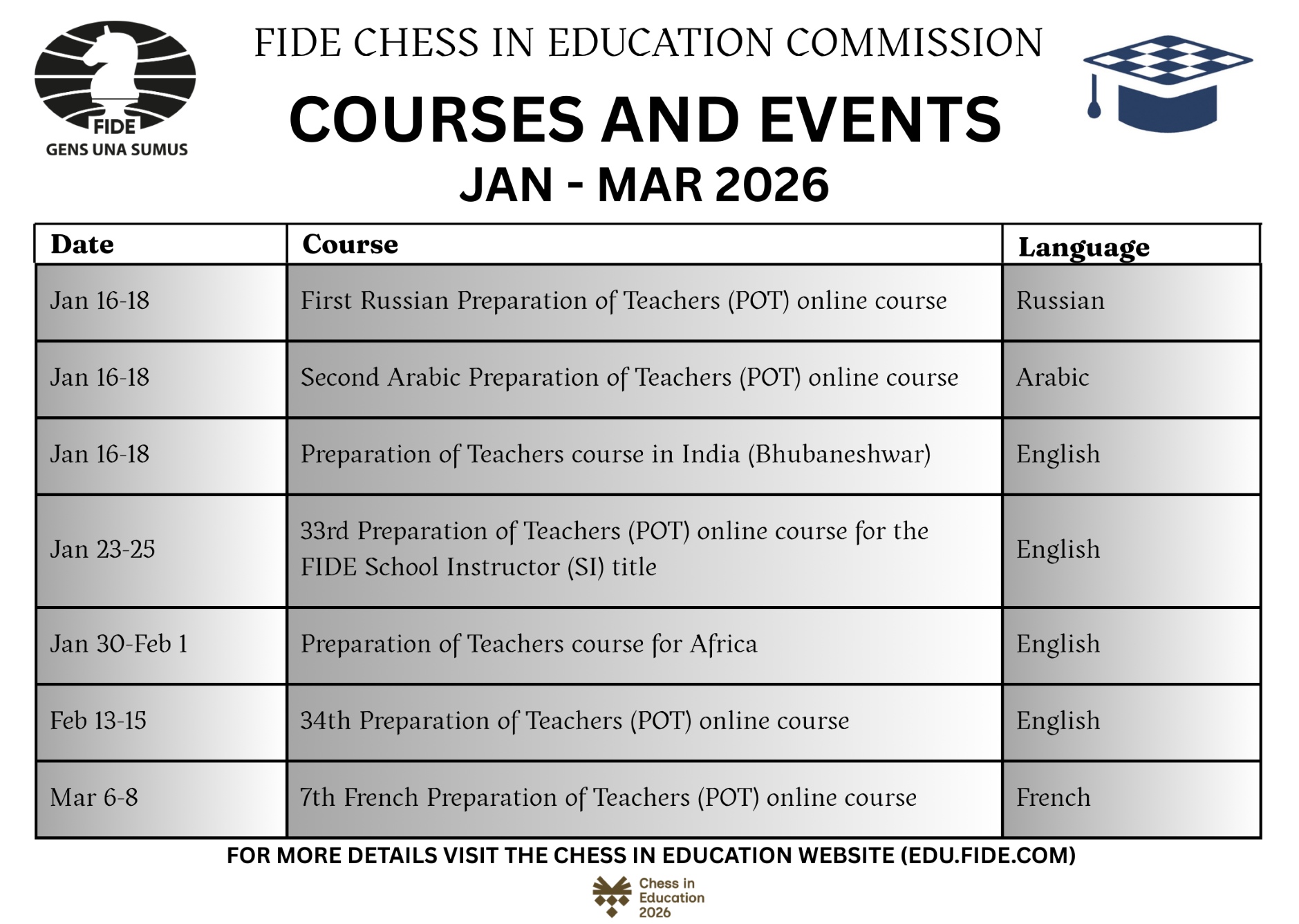 A Comissão de Xadrez na Educação da FIDE continua a expandir suas oportunidades de formação para professores e instrutores de xadrez educacional, oferecendo uma série de eventos online e presenciais de alto nível no inverno de 2026.